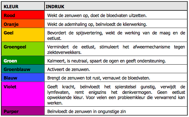 Er is veel onderzoek gedaan naar het psychologische en het lichamelijke effect op of in het menselijk lichaam. In het schema hieronder zie je het lichamelijke effect waarop een kleur of kleurgebied invloed zou hebben. Het is psychologisch dus subjectief. Maar dat kleur ons gedrag beïnvloedt staat vast.