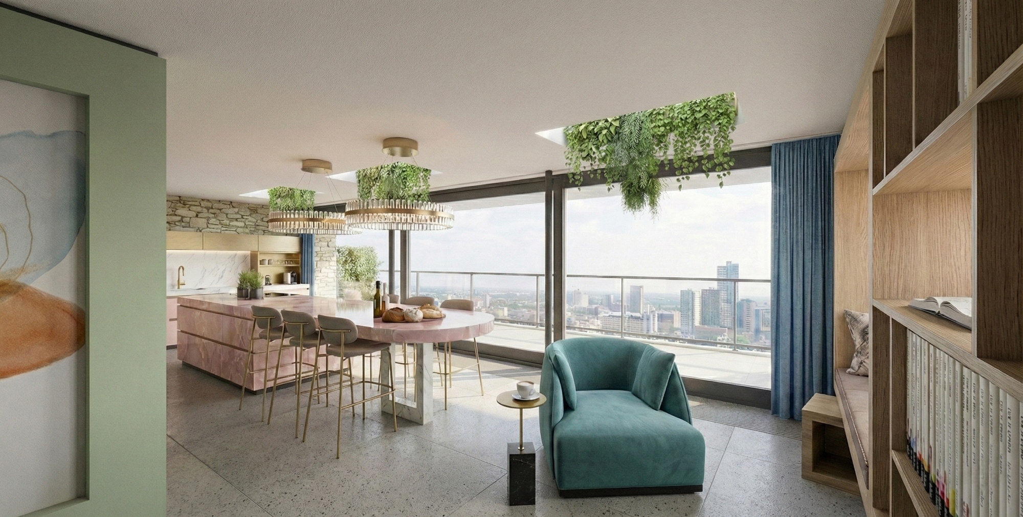 Gordijnen dicht, ondanks die mooie skyline. Even in de cocon met een goed glas. Samen. Alles klopt, niets in de weg.