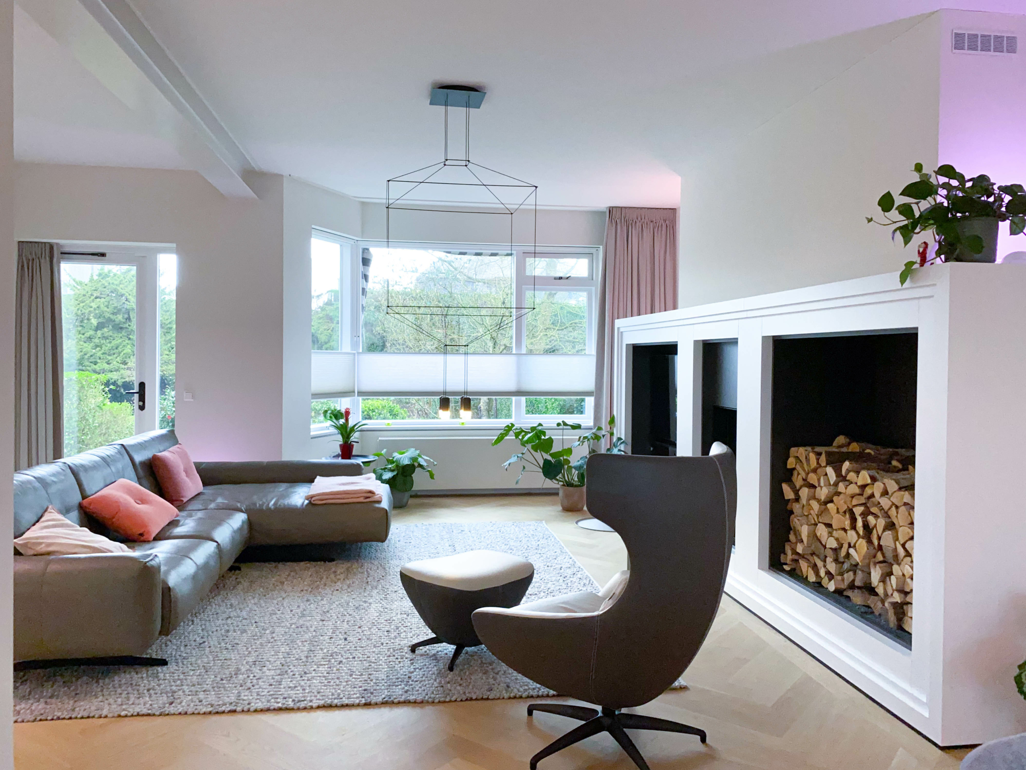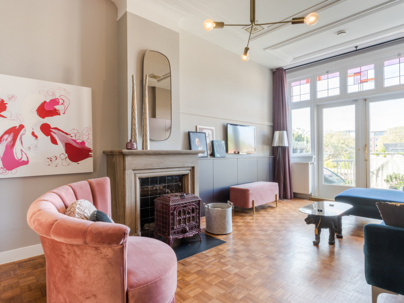 De oudste dochter slaapt op de tweede verdieping. Haar kamer is in haar favoriete kleuren, zacht roze met rosé-goud behang. Een twijfelaar, een bureau groot genoeg voor twee stoelen zodat er een vriendin bij kan, wandkastjes en vitrinekubussen voor haar knutselwerk. Eigenwijs, sociaal, en een eigen verdieping. Dat past.