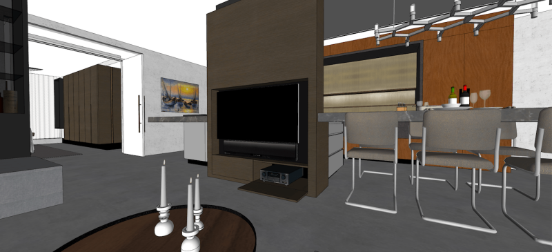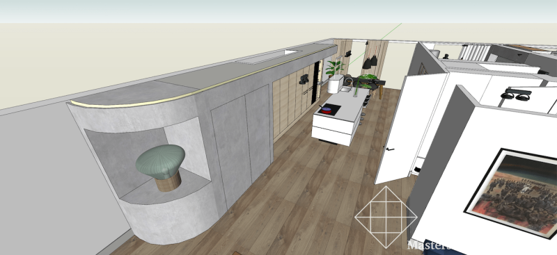 De technische ruimte en de grote leidingschacht zaten in dit appartement in de weg. Onze opdrachtgever kwam er zelf niet uit om tot een mooie, samenhangende oplossing te komen die ook nog praktisch is. We hebben een groot statement rondom beide elementen gemaakt, terwijl daar tegenover bij de zithoek een andere grote tegenhanger in de vorm van een hoge houten wand te vinden is. Achter deze wand is het privé domein.