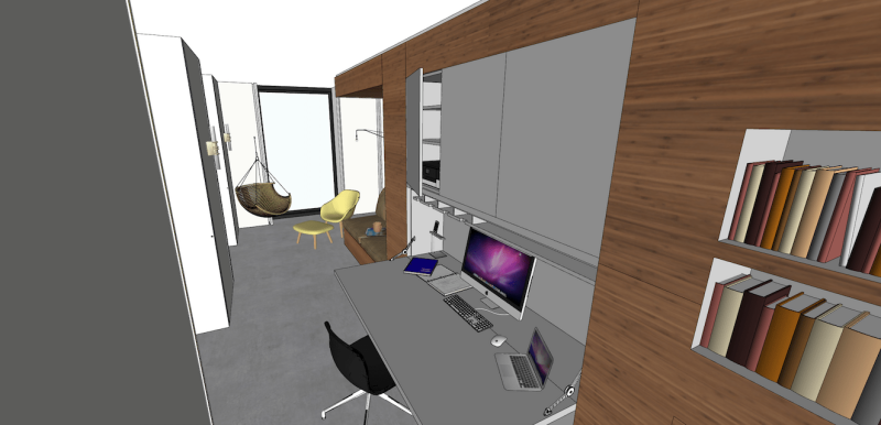 De gang wordt hier dubbel gebruikt met opbergen, werken, logeren en loungen.