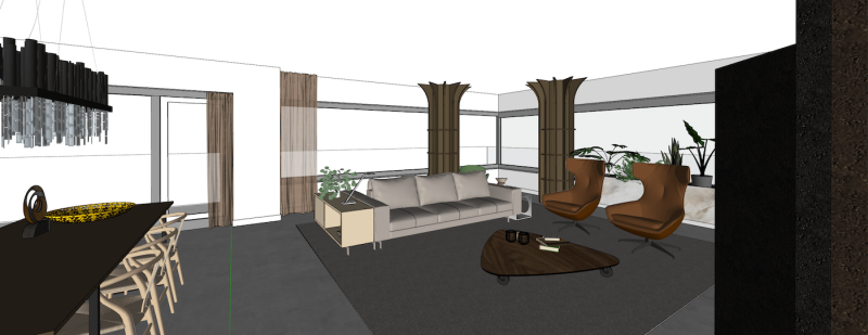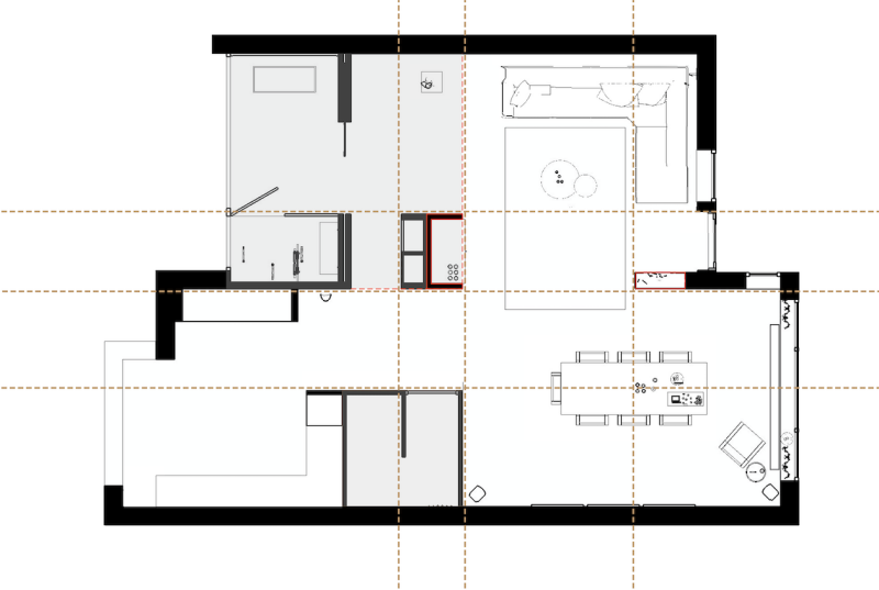 Niet te verplaatsen aansluitingen van de badkamer, een te kleine keuken en een grote constructieve wand die het appartement in tweeën deelt. Maar bovenal, de kolommen op het mooiste stukje van het appartement. Door zowel te camoufleren als te accentueren en iedere andere spelregel uit dit bericht toe te passen konden wij een optimale oplossing voor de bewoners vinden, passend bij hun lifestyle. Iets waar ze zelf niet uit leken te komen.